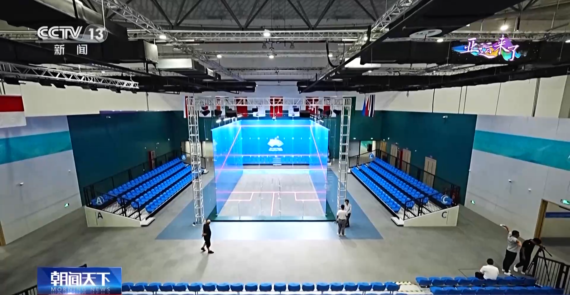 总台央视记者 黄达:一般的壁球馆所采用的墙体是白色的不透明的墙体,但是在亚运会的壁球馆,三面都采用的是蓝色的半透玻璃墙。这里有个关键词——半透。大家在观众席上的时候,可以清晰地通过半透玻璃墙看到赛场内的比赛情况,而且是可以实现360度的观赛。而在赛场内部,也能够保证运动员专注地去进行竞技而不受打扰。