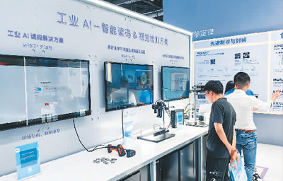 观众在英特尔展区的工业AI展台参观手持智能终端、视觉控制器等设备。