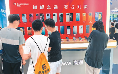 观众在高通展区体验搭载骁龙移动平台的智能手机。