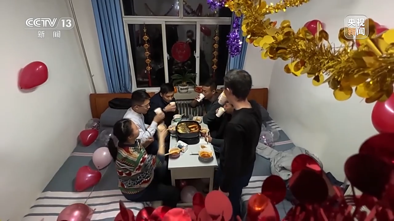 远处是列车鸣笛,近处是火锅蒸腾,宿舍内喜庆的兔年窗花显得年味儿十足。虽离家千里万里,大家心里的千言万语,诉说着或近或远的牵挂,在这一刻尤其清晰。
