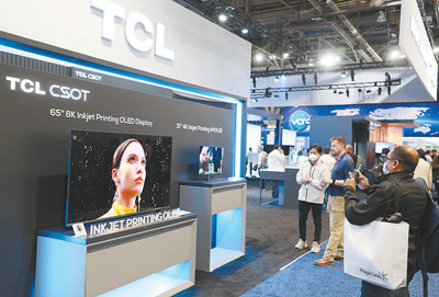在展会上,参观者驻足观看TCL推出的65英寸8K印刷OLED显示器。