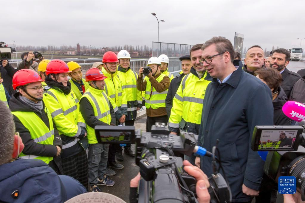 1月11日,塞尔维亚总统武契奇(右)在首都贝尔格莱德视察“新贝尔格莱德-苏尔钦”高速公路项目施工现场时与塞中两国建设者见面。新华社记者 石中玉 摄