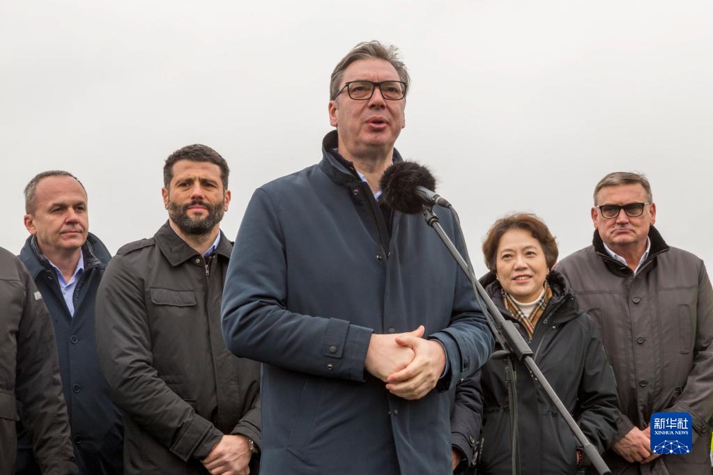 1月11日,塞尔维亚总统武契奇(中)在首都贝尔格莱德视察“新贝尔格莱德-苏尔钦”高速公路项目施工现场时讲话。新华社记者 石中玉 摄