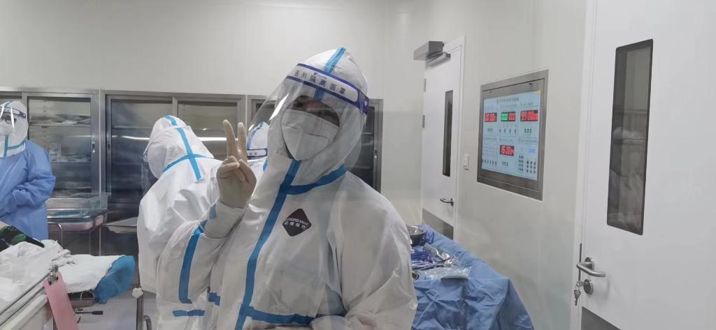 2022年12月,余腊梅穿上防护服准备为阳性孕产妇做手术。(受访者供图)