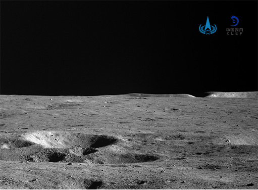 △第49月昼期间,当玉兔二号月球车行驶至LE04905点时,全景相机拍摄的撞击坑边缘隆起,远处还可以看到接着天际线的冯卡门坑边缘。