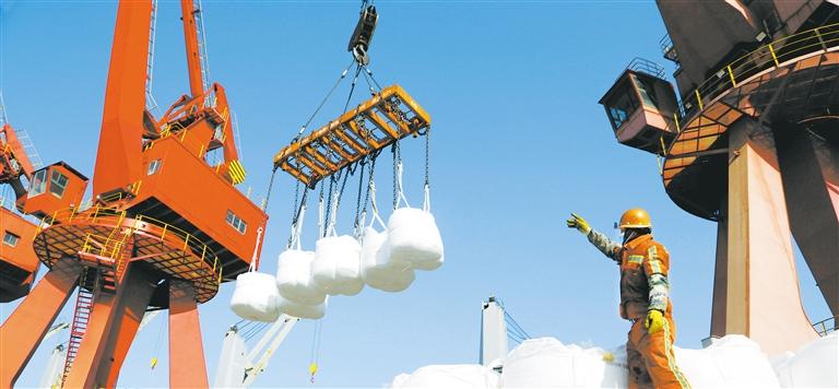 ▲1月21日,工人在江苏连云港港东方公司码头泊位上装运物资,坚守岗位保生产。王 春摄(中经视觉)