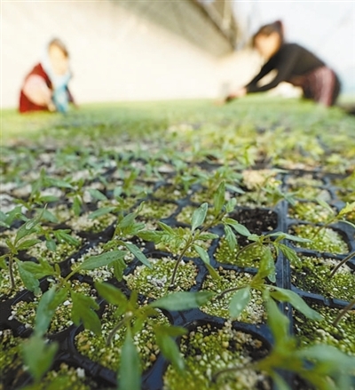 1月10日,河北省唐山市丰南区大新庄镇一家育苗基地的员工在管护西红柿秧苗。新华社记者 杨世尧摄