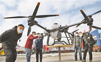 1月16日,山东省聊城市东昌农机大市场,东昌府区大徐村村民选购植保无人机,准备春节后对小麦进行植保飞防作业。张振祥摄(影像中国)
