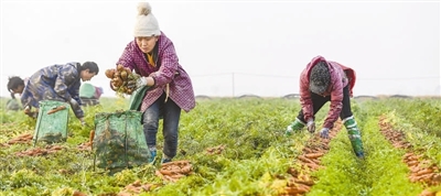 1月10日,江西省丰城市曲江镇曲江村,村民在种植基地采收胡萝卜。周 亮摄(影像中国)