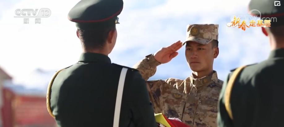 在西藏军区某边防团,我们的采访对象战士杨八斤庄严地从战友手中接过一面有特殊意义的五星红旗。春节前,他要把这面五星红旗护送回自己所在的连队。