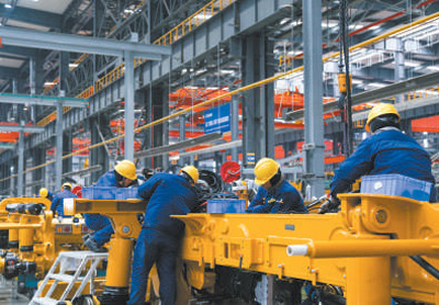 记者在徐工集团调研时,矿用机械转配生产线上工人正在紧张作业。单文喜摄