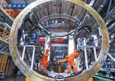 记者在中铁装备天津公司生产车间采访时,工人在为盾构机组装电缆、连接管路。何沛霖摄