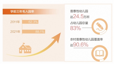 李树庆的感受是近年来我国学前教育跨越式发展的一个缩影。人生百年,立于幼学,学前教育关系亿万儿童健康成长。记者从教育部了解到,2021年我国幼儿园在园幼儿数达4805.2万人,比2011年增加1380.8万人,学前三年毛入园率由2011年的62.3%提高到2021年的88.1%,增长了25.8个百分点,学前教育实现基本普及,广覆盖、保基本、有质量的学前教育公共服务体系基本建成,幼有所育取得历史性成就。