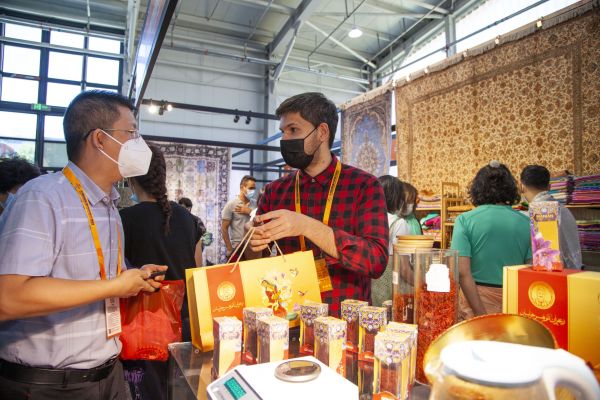 2022年9月5日,在北京举行的中国国际服务贸易交易会上,参观者在文旅服务专题展区伊朗展台购买商品。(新华社)