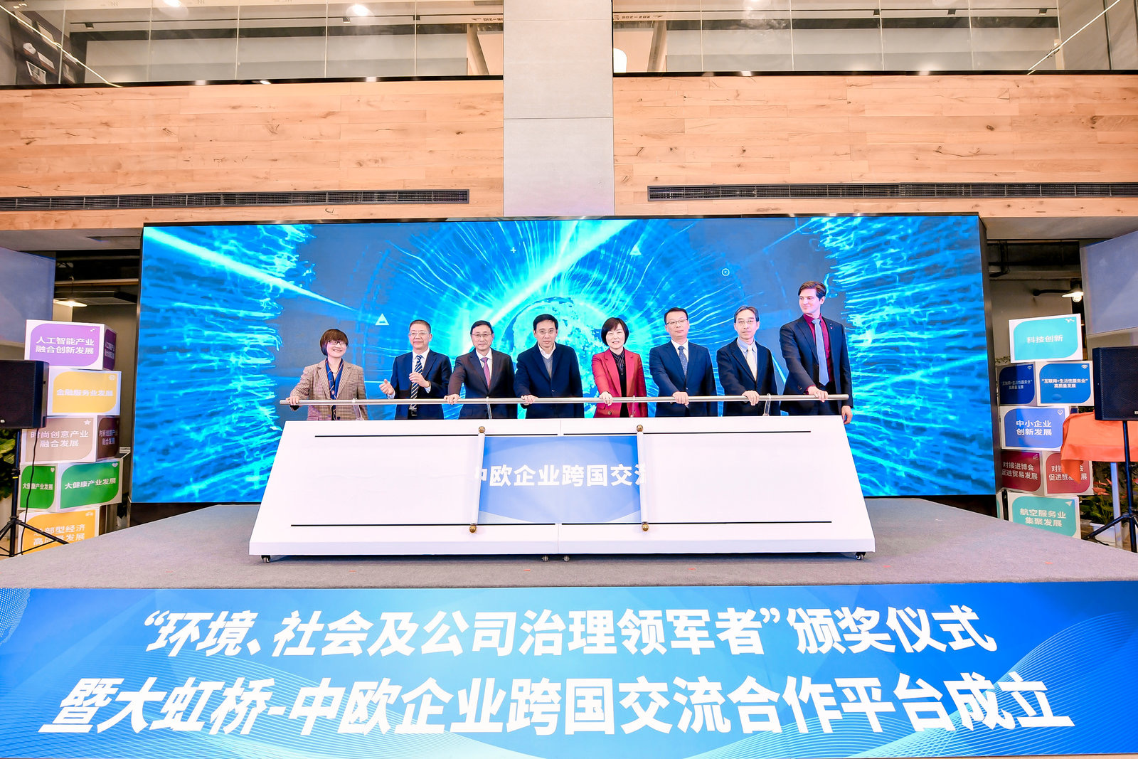 2月22日下午,大虹桥-中欧企业跨国交流合作平台成立活动在上海长宁区大虹桥营商服务中心举办,现场还颁出了“环境、社会及公司治理领军者”奖项。