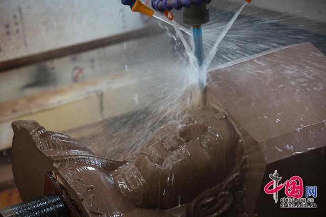 数控雕刻等现代技术的引入,需要石雕匠人进现代学校去接受专业培训,以此来提高石雕人才的培养效率。图为在切刀和水流的共同作用下,一件石雕作品初具轮廓。中国网记者 伦晓璇 摄