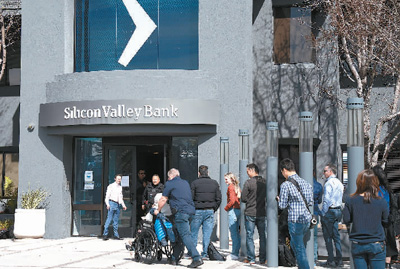 三月十三日,客户在美国加利福尼亚州圣克拉拉市硅谷银行总部外排队等候办理业务。李建国摄(新华社发)