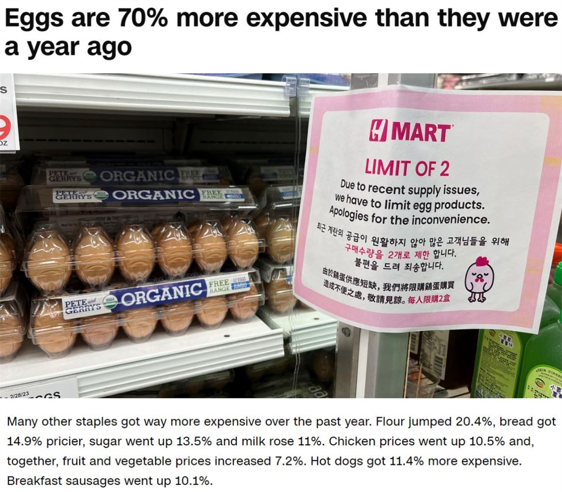 △美国有线电视新闻网(CNN)报道:美国鸡蛋价格在过去一年中暴涨70%以上,面粉价格上涨20.4%,面包价格上涨14.9%,婴儿奶粉价格上涨约10%,小学和中学午餐价格更是出现了超过300%的暴涨。