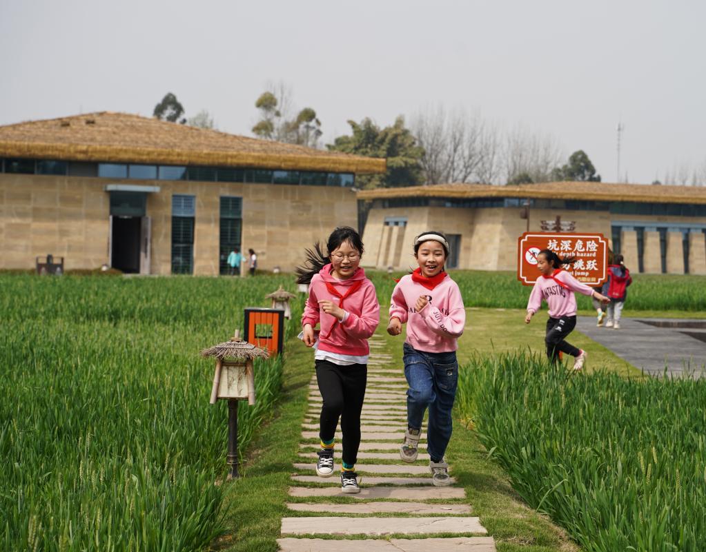 3月14日,学生们在位于成都市新津区的宝墩遗址展馆麦田里游玩。新华社记者邢拓 摄
