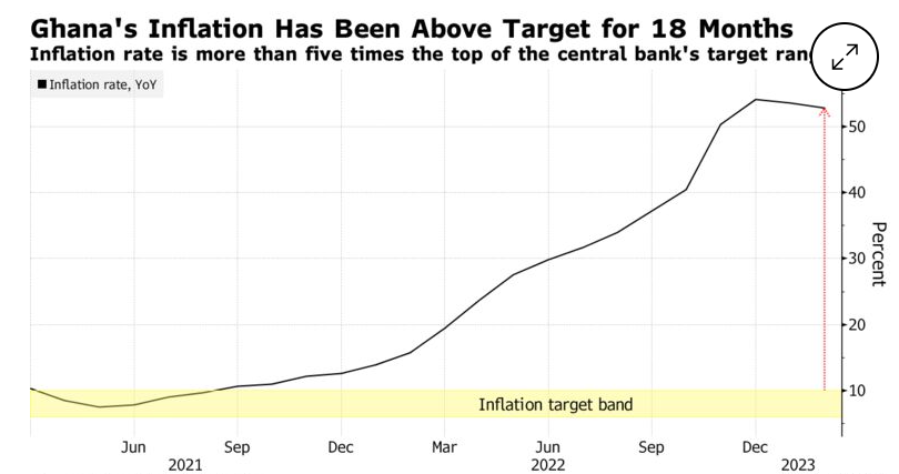 据了解,加纳的通货膨胀率已连续18个月高于目标水平,通胀率是央行目标区间上限的五倍多。