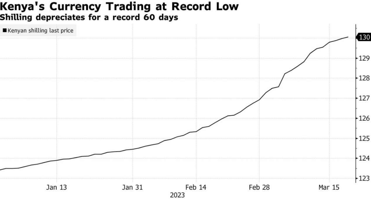 截止到当地时间3月20日,肯尼亚先令已经历了连续60天下跌。受到美元加息、外汇储备减少和国际收支恶化担忧等因素,有机构预测,预计到年底,肯尼亚先令对美元的汇率将低至161.40:1。