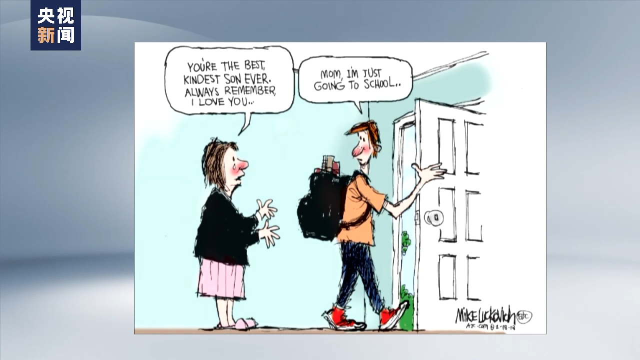 枪支暴力已经成为美国孩子的“头号杀手”。在这幅漫画中,母亲流着眼泪,对准备出门上学的孩子叮嘱道,“你是最好、最善良的儿子,永远要记得这一点,我爱你。” 孩子则有点疑惑地说,“妈妈,我只是去学校。” 这就是校园枪击案频发令无数父母终日胆战心惊的真实写照。