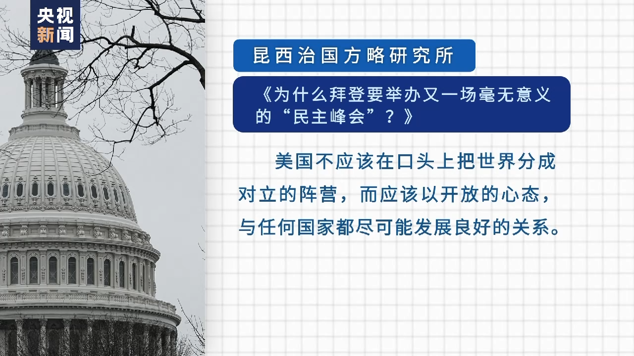 昆西治国方略研究所发表题为《为什么拜登要举办又一场毫无意义的“民主峰会”?》的文章。文章将所谓“民主峰会”称为“只不过是美化了的清谈俱乐部”。文章说,美国不应该在口头上把世界分成对立的阵营,而应该以开放的心态,与任何国家都尽可能发展良好的关系。如果美国真正尊重其他国家,就必须接受他国可能对重要的国际局势发展采取与美国不同甚至对立的观点。美国领导人不应自欺欺人地认为他们的喜好就是所有国家的喜好。