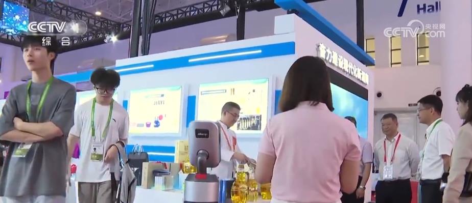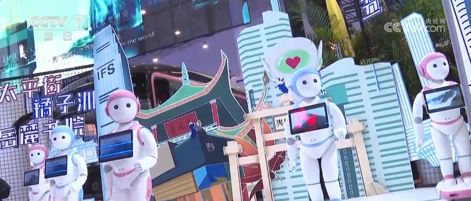 在湖南展区,这台拥有80多项专利技术的机器人会唱歌、会跳舞、会对话、会给小朋友上课。它还担任着推荐各参展品牌的重任。
