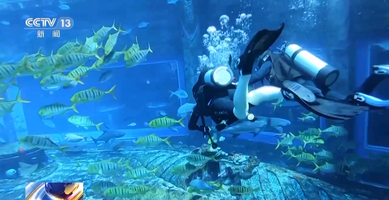 △ 在水族馆里体验潜水的游客
