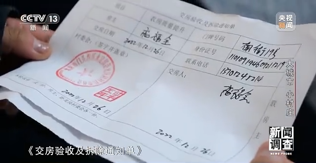 在庞福全临时租住的家中,他给我们展示了自己的《交房验收及拆除通知单》和《农房提升意愿统计单》。