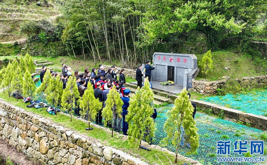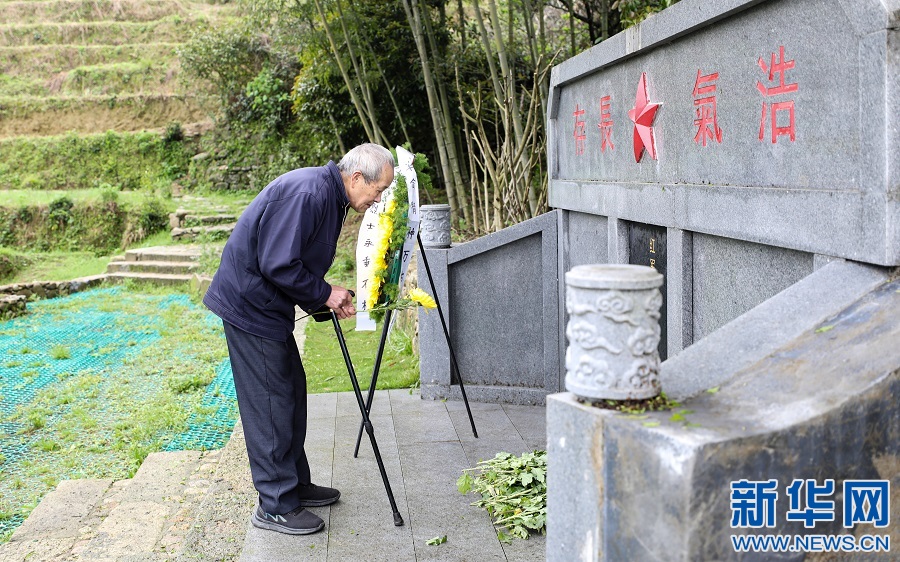何清阳正在祭扫红军连长。新华网发 江海 摄