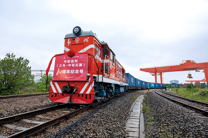 载有 100 标准箱货物的“义乌-中亚五国10周年纪念号”中欧班列在义乌西站鸣笛启程,前往中亚五国(2023年4月23日摄)胡肖飞摄/本刊