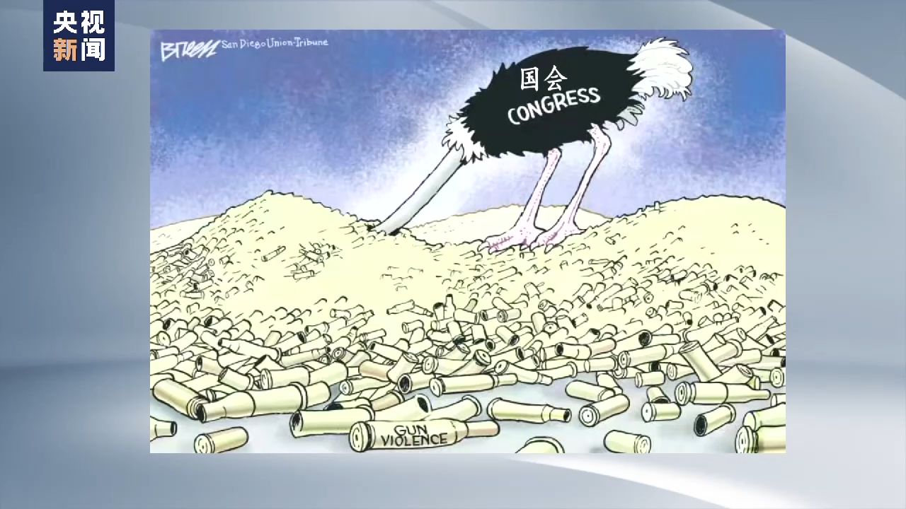 这张漫画更加形象地描绘了美国枪支暴力的现状。画中,在“枪支暴力”的子弹堆上,象征美国国会的鸵鸟将头深深地埋入其中。