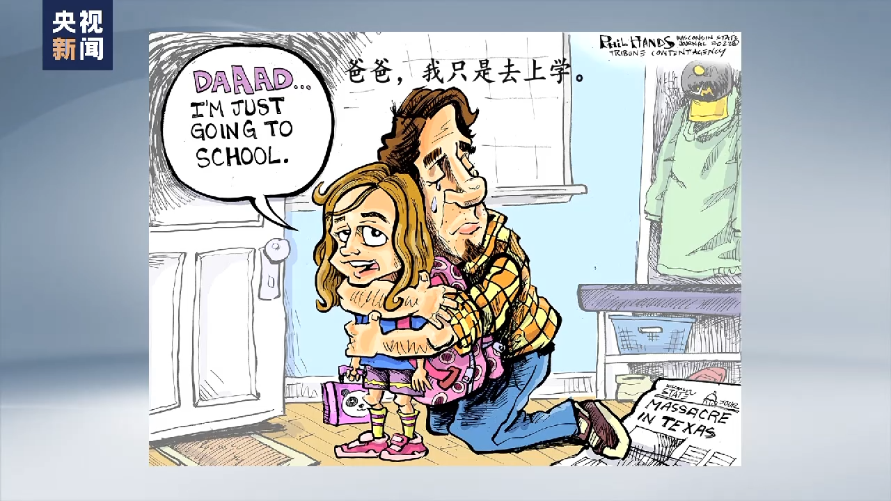 正如这张漫画所展示的,在得州枪支暴力的背景下,一位父亲流着泪抱紧自己的女儿,而小女孩说,“爸爸,我只是去上学。”
