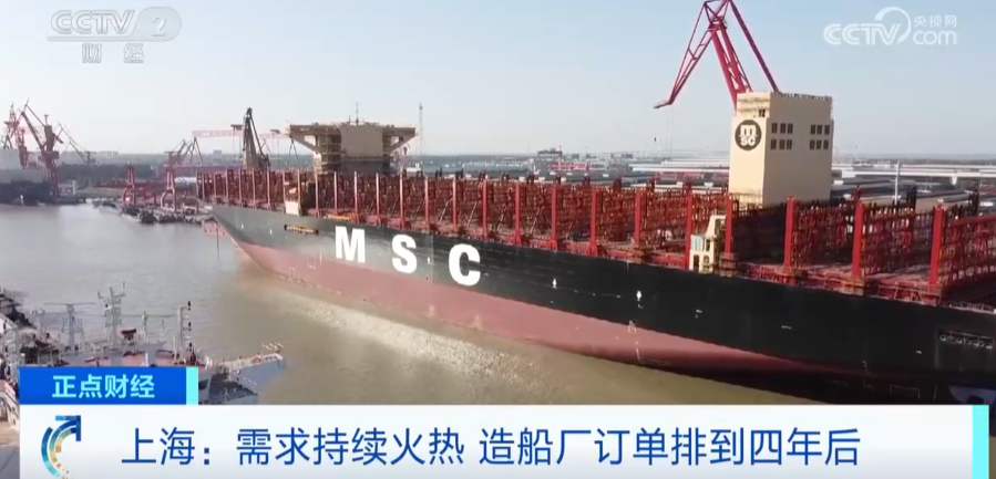 在位于上海市长兴岛的江南造船基地,码头上停靠着三艘全球最大级别的集装箱船和一艘液化气船。据了解,今年集装箱船、气体船和汽车滚装船的订单非常多,目前共有24艘,已经超过了去年全年的水平。