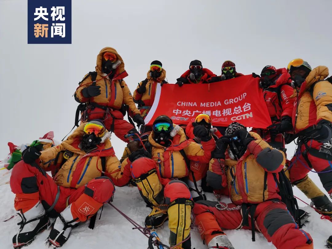登顶队员在珠峰峰顶展示五星红旗↓