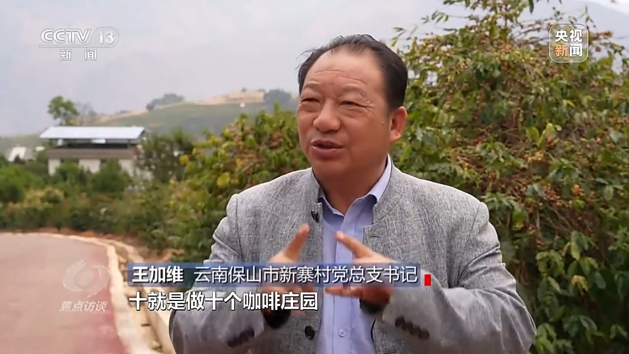 云南保山市新寨村党总支书记 王加维:十就是做十个咖啡庄园;百是有五百多户人家,提出一百户做农家咖啡小院,已经全部启动了;千是专门划了一千亩的一块基地,海拔在1200米,种全球最昂贵的瑰夏咖啡;万是万亩咖啡园,逐步全部把它改良成精品咖啡。我们总的目标是以产业带动旅游的模式,让全村人民共同富裕。