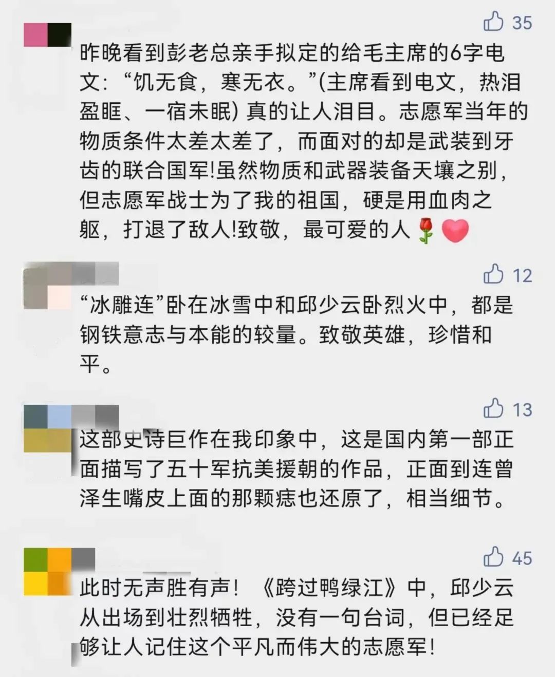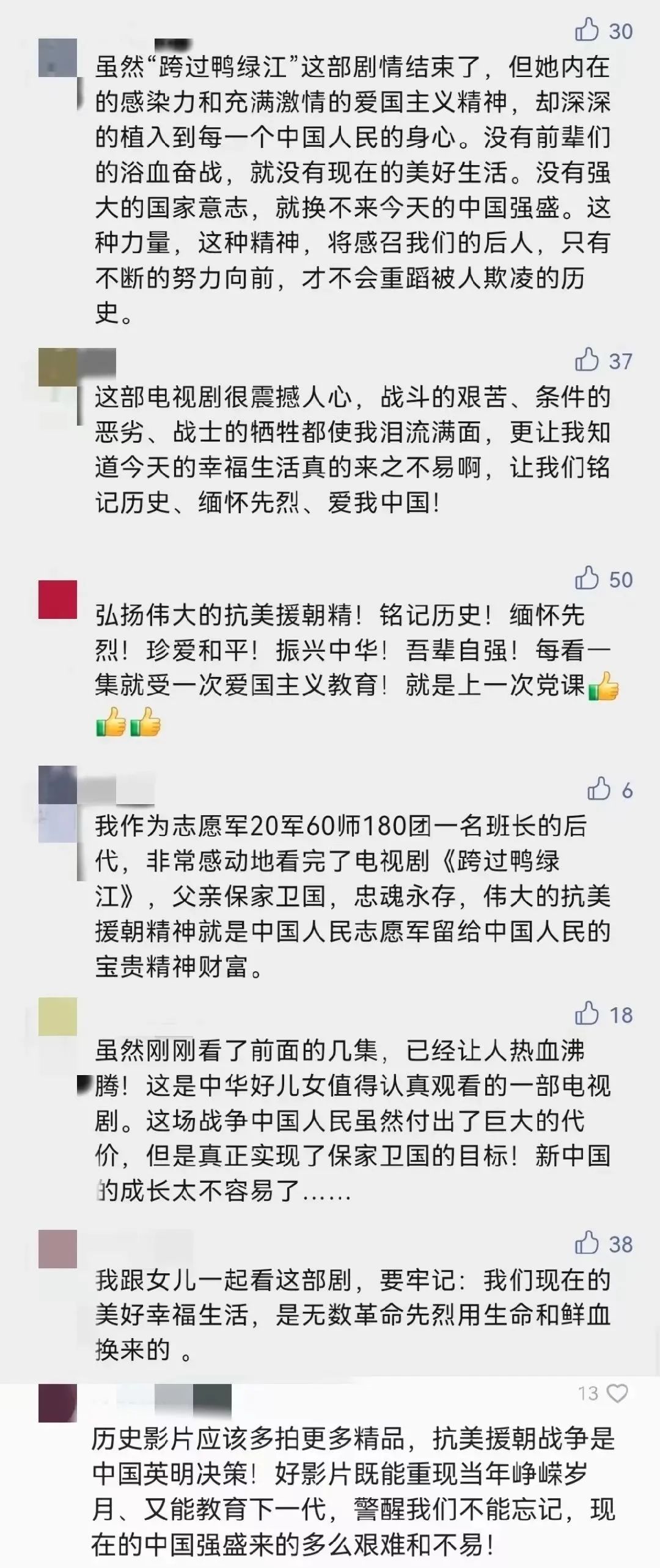“抗美援朝绝对是值得纪念和讴歌的奇迹!这部电视剧是一部爱国主义教育的活教材!”这是网友对这部剧的评价。
