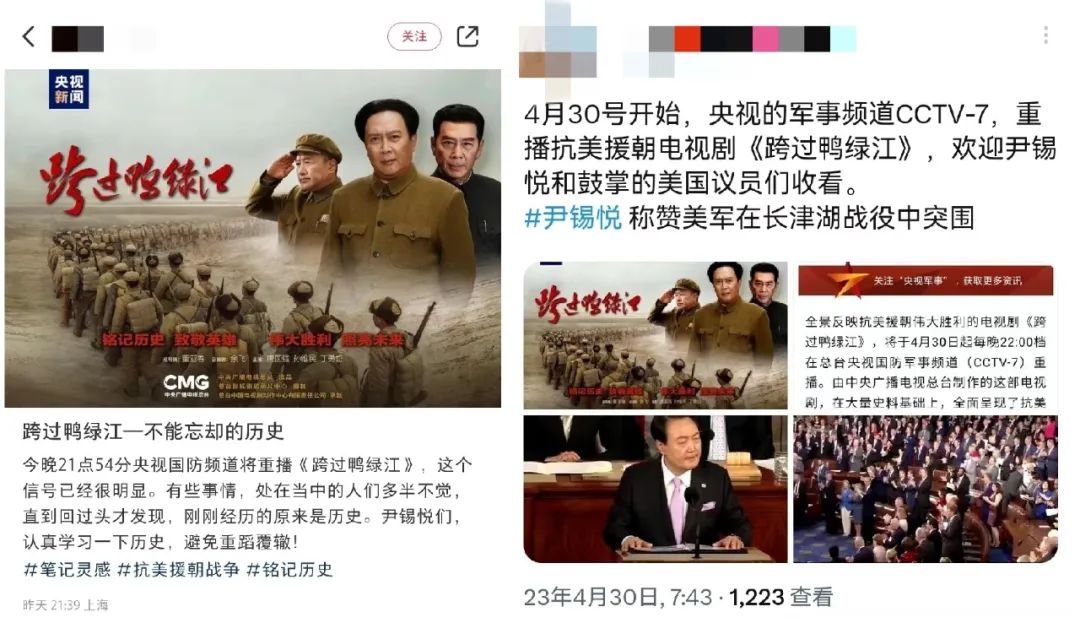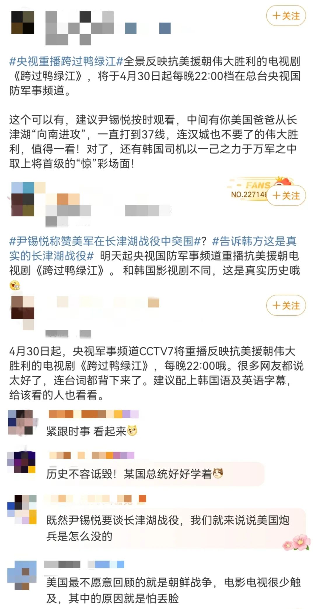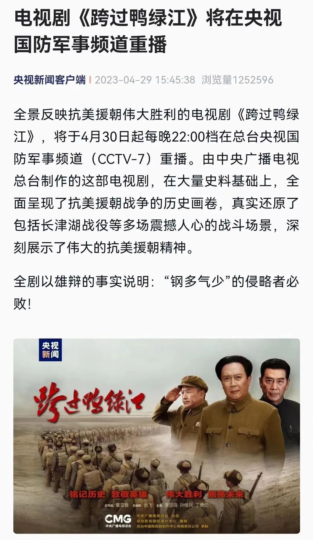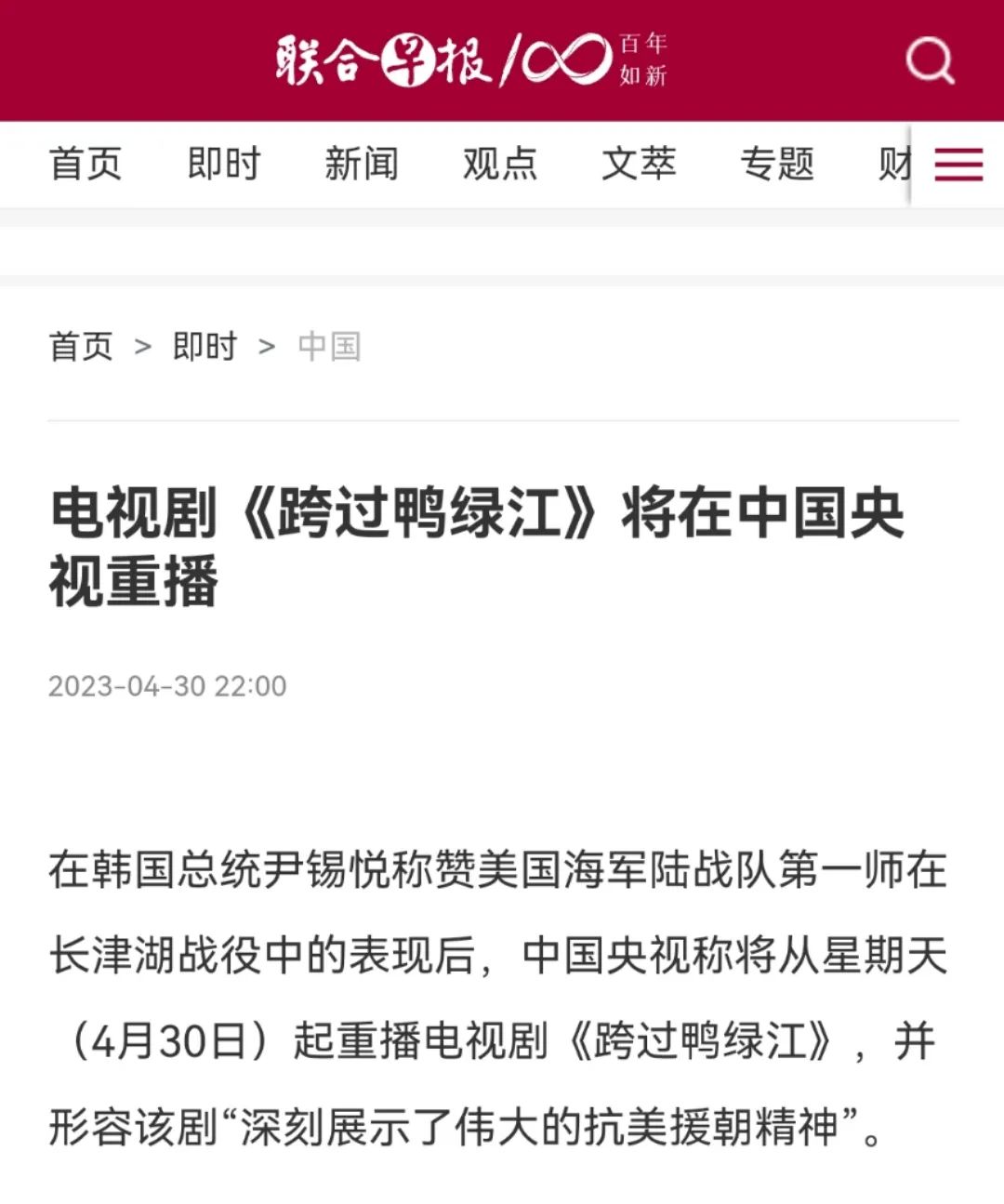 新加坡《联合早报》更在4月30日晚10点准时发布文章《电视剧<跨过鸭绿江>将在中国央视重播》,开篇明确重点:在韩国总统称赞美国海军陆战队第一师在长津湖战役中的表现后,中国央视称将从星期天(4月30日)起重播电视剧《跨过鸭绿江》。