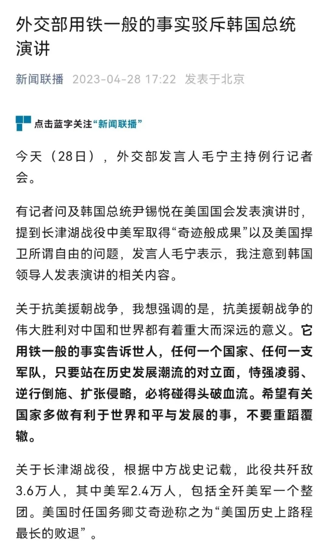 根据外媒报道,韩国总统4月27日在美国国会发表演讲称,美国海军陆战队第一师在长津湖战役中取得了所谓的“奇迹般成果”。