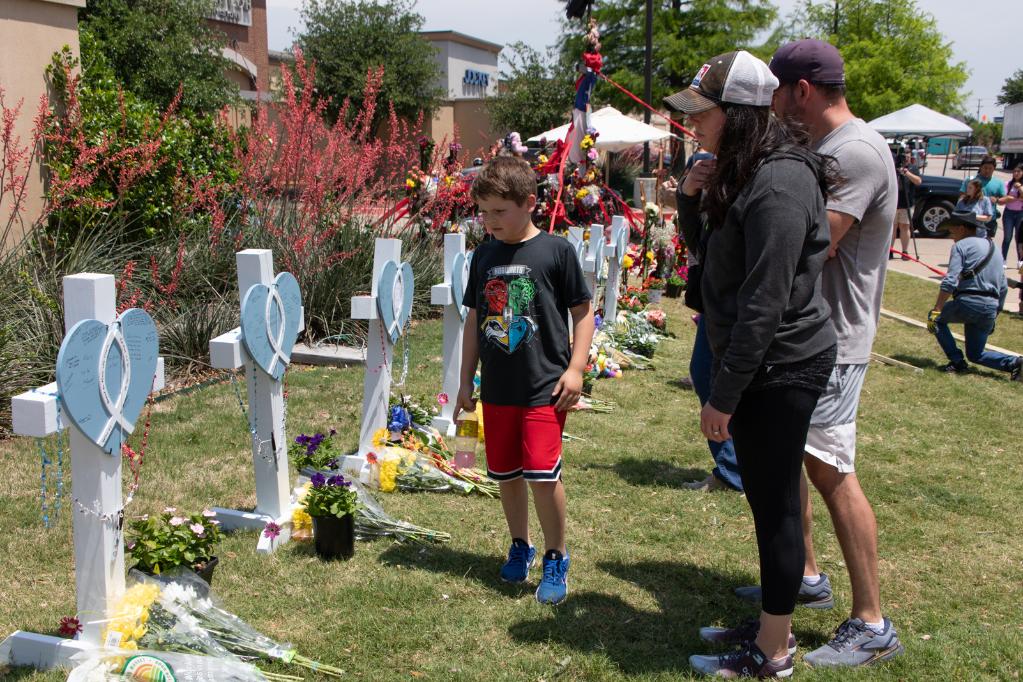 5月8日,在美国得克萨斯州达拉斯以北城镇艾伦,人们在购物中心枪击事件现场附近悼念受害者。达拉斯以北城镇艾伦的一家购物中心6日发生枪击事件,造成包括枪手在内的9人死亡、7人受伤。新华社发(田丹摄)