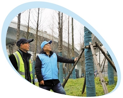 湖北省武汉市复兴体育公园内,吕军(右)和园林养护人员在查看树木生长情况。 王郭骥摄(人民视觉)