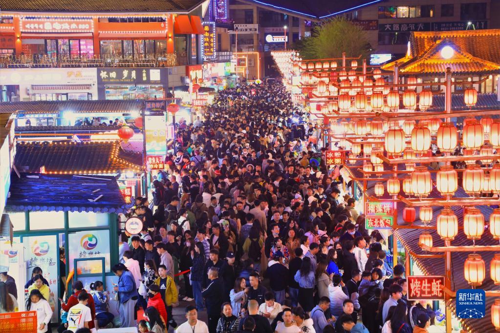 4月30日,游客在山东省威海市韩乐坊夜市品美食、逛夜市。新华社发(朱春晓 摄)