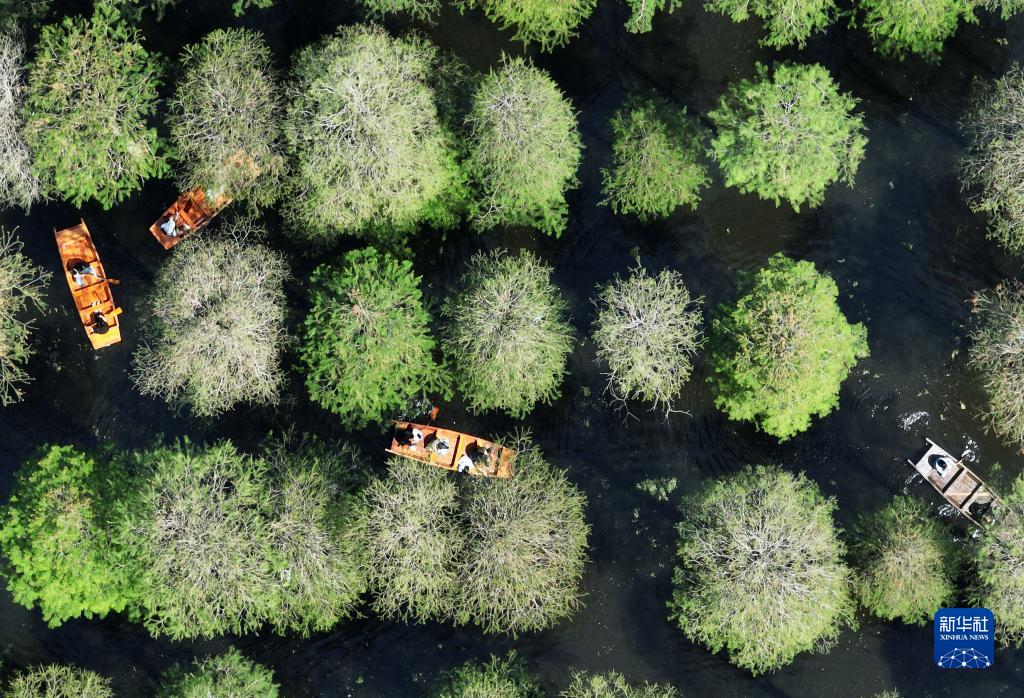 5月1日,游客在江苏省扬州市渌洋湖湿地公园的水上森林乘船游览(无人机照片)。新华社发(孟德龙 摄)