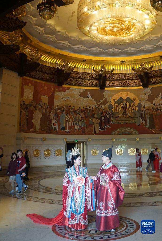 5月1日,两名古装爱好者在河南洛阳隋唐洛阳城国家遗址公园留影。新华社记者 侯俊 摄