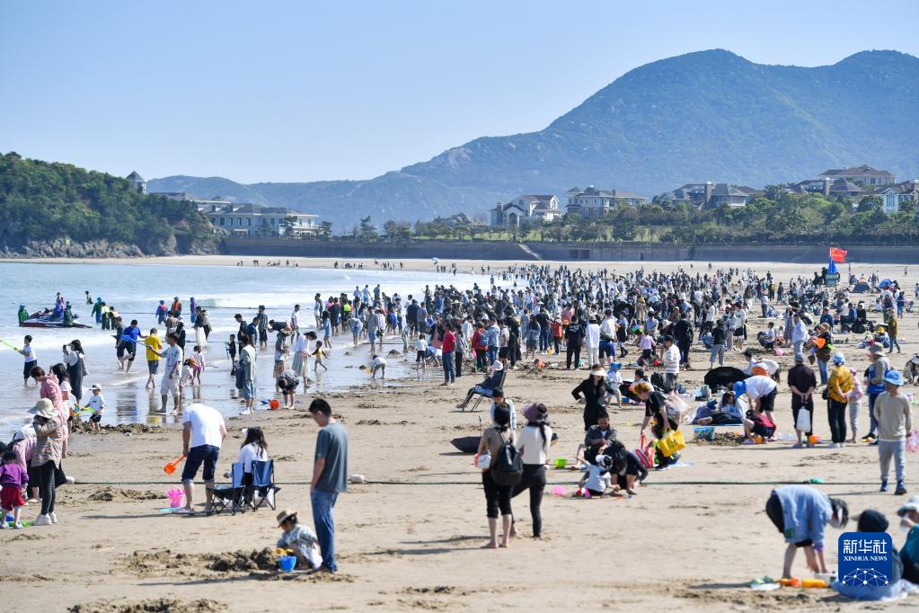 4月30日,游客在浙江舟山朱家尖景区沙滩上嬉戏游玩。新华社发(沈磊 摄)