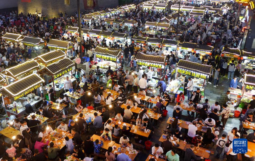 4月30日,游客在河南省开封市鼓楼夜市品尝小吃。新华社发(李俊生 摄)