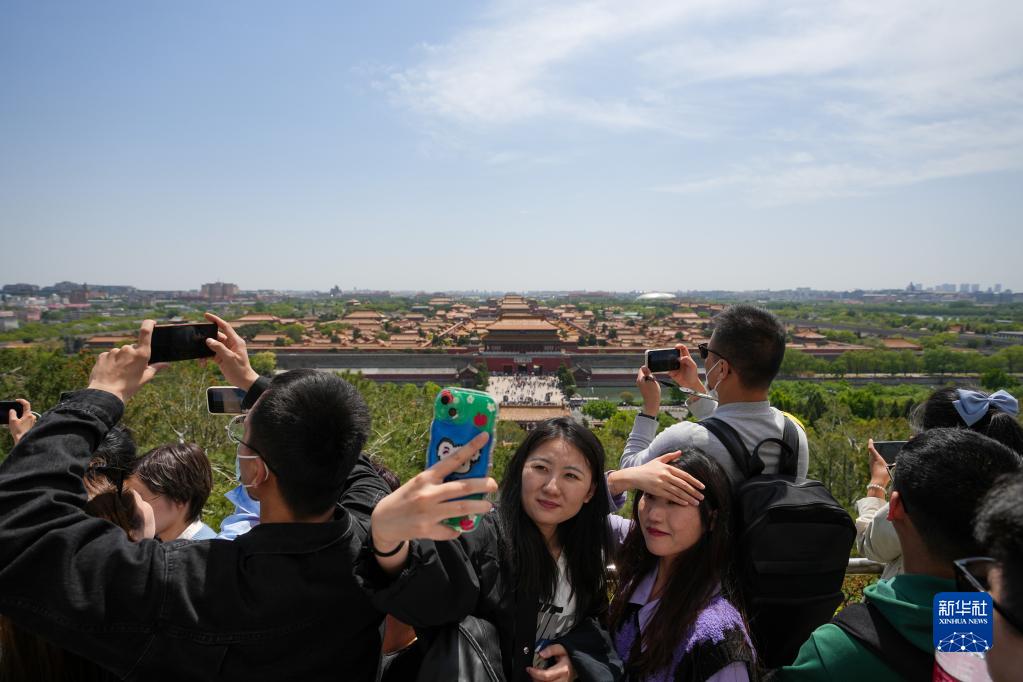 4月29日,游客在北京景山公园登高赏景拍照。新华社记者 鞠焕宗 摄