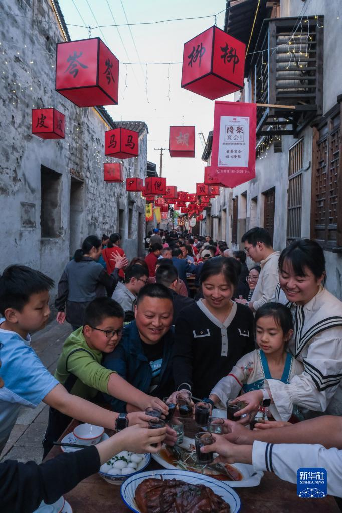 5月1日,在浙江嘉兴桐乡市崇福镇运河文化历史街区的横街上,游客参加古镇特色长街宴。新华社记者 徐昱