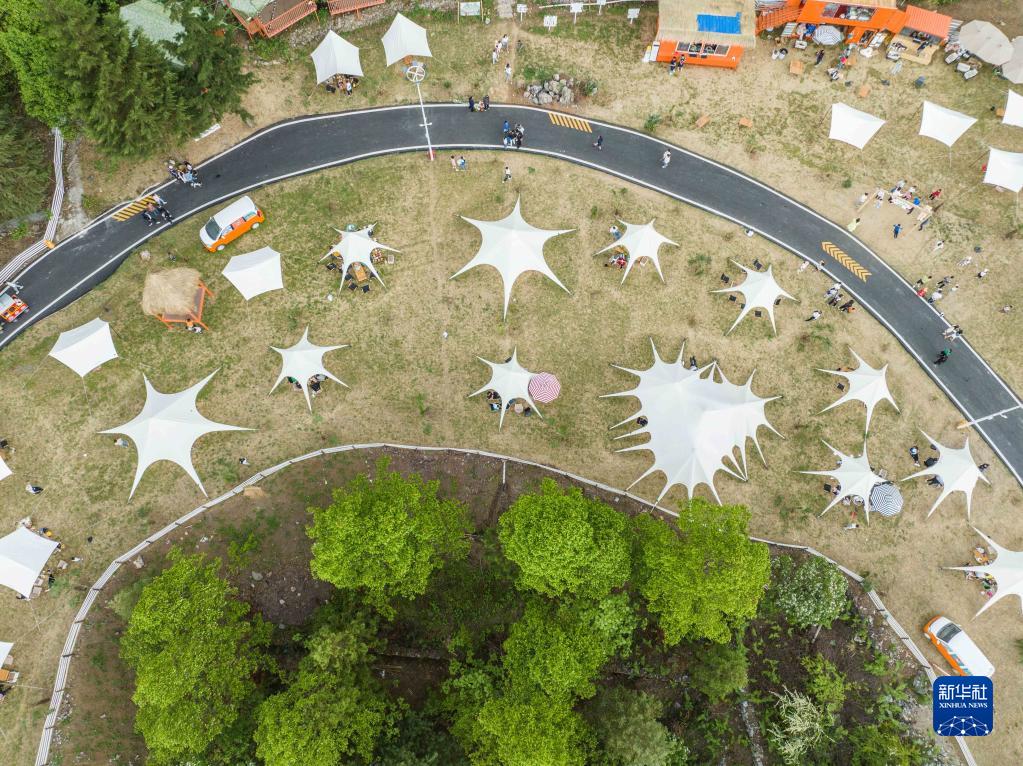 5月1日,游客在贵州省毕节市赫章县硐上村游玩(无人机照片)。新华社发(罗大富 摄)